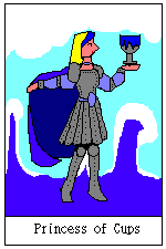 黄金の夜明け団に伝わるタロット文書『Tの書』によれば、杯の王女は「美しい女戦士風の姿」で「泡立つ海の上に立って」いて、白鳥の羽毛で縁取りされたマントをはおっているとされる。さらにイルカだのウミガメだのと細かい象徴も導入される。