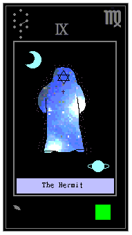 名称 : 隠者 称号 : 光の声の術士、神々の預言者 配属 : ヨッド 惑星 : 処女宮 位置 : ケセド − ティファレト 色彩 : 緑黄 |
