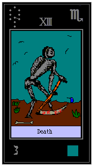 名称 : 死 称号 : 大いなる変革者の子、死の門の主 配属 : ヌン 宮 : 天蝎宮 位置 : ティファレト − ネツアク 色彩 : 青緑 |