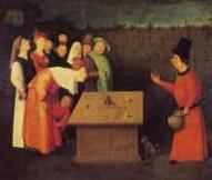下はヒエロニムス・ボッシュが描く「手品師」(1450年頃)。大道賭博の典型例といえるでしょう。また、手品師の足元にいる犬に注目。こういう状況での犬は、描かれた人物が放浪者であることを示す作画上の約束事なのです。